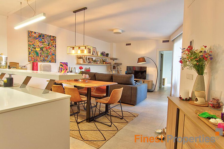 The modern kitchen is functionally designed and harmoniously integrated into the living area. For year-round comfort, the property is equipped with a heating system and air conditioning (hot/cold). High-quality flooring and contemporary finishes underline the modern character of the apartment.