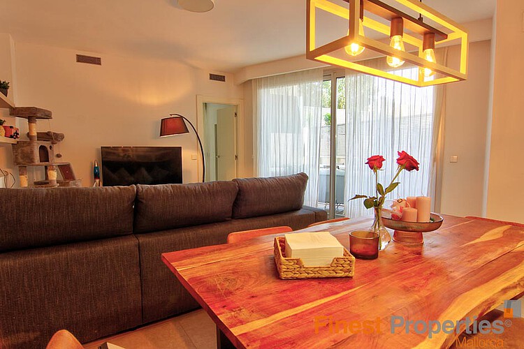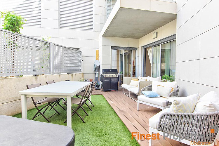 The apartment impresses with its well-designed layout and high-quality modern features. It offers three bedrooms and two stylishly designed bathrooms. The bright and spacious living and dining area provides direct access to a lovely terrace and a small private garden, ideal for relaxing outdoors, enjoying cosy evenings or sunny breakfasts.