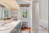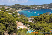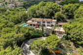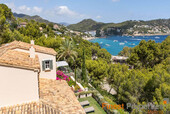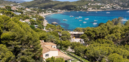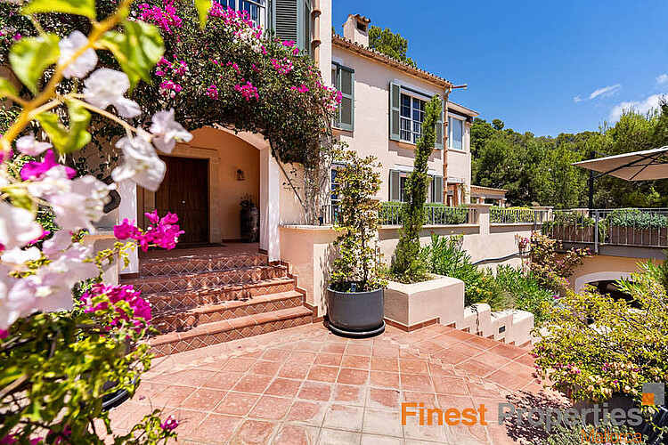 Camp de Mar is a very popular residential area in the southwest of Mallorca and belongs to the municipality of Andratx. The property is located on a hillside plot of approximately 2200m² with sea views and offers approximately 290m² of living space on two levels plus a basement. With six bedrooms and four bathrooms, it offers ample space for a family with children and guests. Features include hot/cold air conditioning in the bedrooms and living/dining area, oil-fired central heating in all areas, a fully equipped kitchen, natural stone floors, a cozy fireplace in the living room, and a Sonos sound system throughout the property. Outside, there is a heated saltwater pool, an outdoor shower, a sauna and a fitness room, an alarm system with motion detectors and cameras, a double garage, and covered outdoor parking spaces. Additionally, there is a large utility room and storage room, and a service elevator.