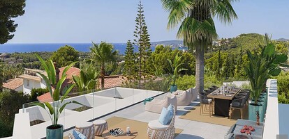 Cas Catala is a very popular and high quality residential area at the gates of Palma. It is only a few minutes' drive to the Bendinat golf course, international schools, supermarkets and restaurants. This modern villa is state-of-the-art and was built to the highest construction quality. It is located on the highest point in Cas Catala on a flat plot of 1219m². It has 4 bedrooms on the ground floor, all with bath en-suite. Two covered terraces offer space for a dining area and a chill-out lounge with a view of the pool and landscaped garden. On the first floor there is the large master bedroom with bathroom en-suite and the open living-dining room with designer kitchen and cooking island. The master bedroom with dressing room and bathroom en suite has its own terrace from which you can enjoy a sea view. From the main living level you can reach the roof terrace from which you have an absolute dream view. The garage offers space for 2 cars and has a freight elevator up to the kitchen on the 1st floor. The equipment includes Schüco panorama windows, stone tiles, BUS house control technology, air conditioning h / c and underfloor heating (heat pump).
