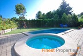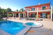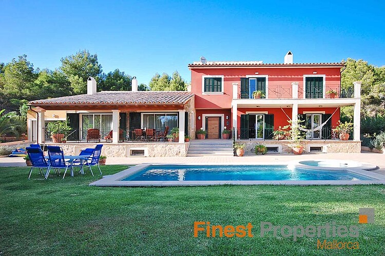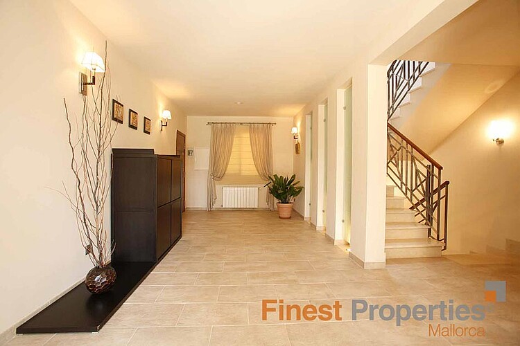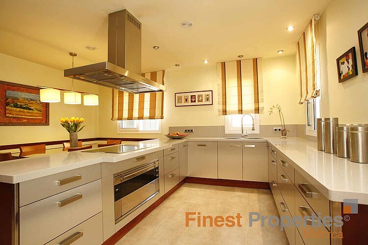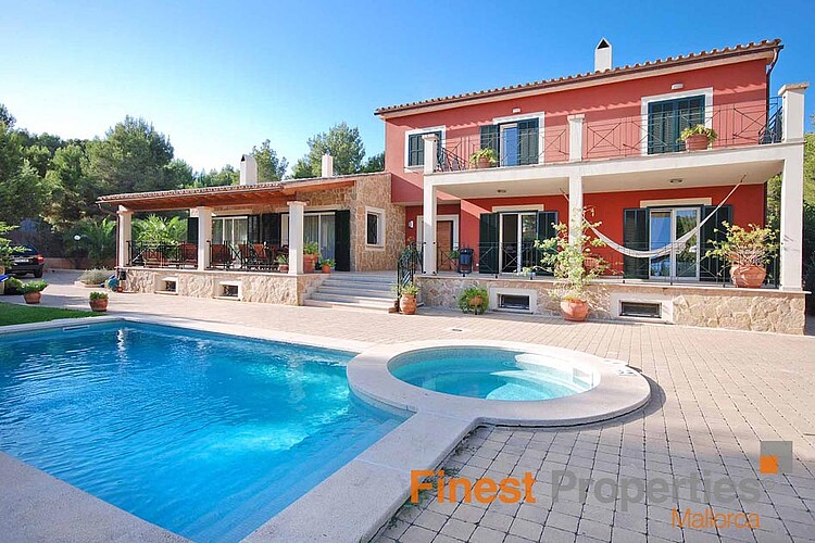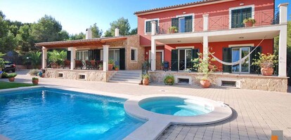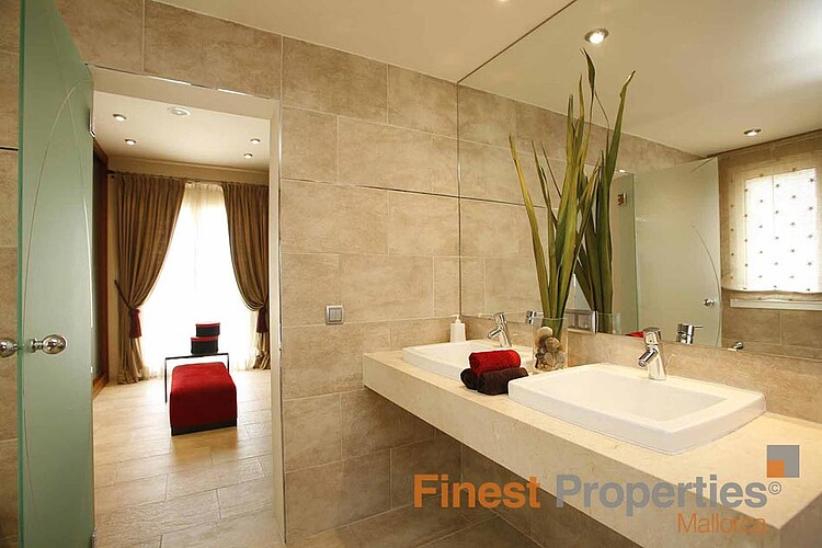 This Mediterranean villa is south facing and offers a constructed area of 470 m² which spreads over 3 floors. The ground floor with spacious terraces comprises of the entrance area, living room with fireplace, open kitchen, double bedroom with en suite bathroom and another bedroom with separate bathroom. The upper floor provides for the master bedroom with dressing area, en suite bathroom and private terrace and 2 further bedrooms with a bathroom. The light-flooded and airy basement of 160 m² has been generously expanded and offers a billiard room, Majorcan kitchen with oven and grill, wine cellar, various utility and storerooms as well as a guest room and bathroom. The interior of the villa was designed by the renowned designer Guillermo Blanco. The garden plot of 2019 m² with fruit trees and lawn area encloses the pool area with separate Jacuzzi. A double garage and several parking spaces are part of the property.