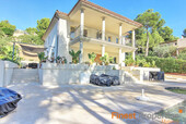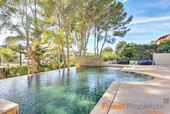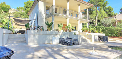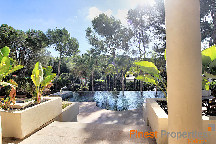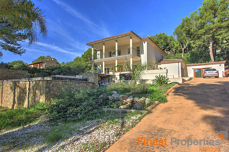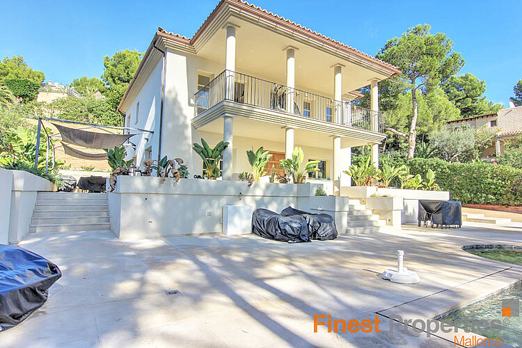 Costa de la Calma is a residential area located between Santa Ponsa and Paguera in southwest Mallorca, with good connections to Palma. The house was built in 2001 on a plot of approximately 2,000 m² and renovated in 2023. The approximately 380 m² of constructed area is spread over two floors. The ground floor features a living/dining room with an open-plan kitchen, a guest WC, a guest apartment with a kitchenette and bathroom, and access to an office. The first floor comprises a master suite with a dressing room, a bedroom with an en-suite bathroom, another bedroom, and a bathroom with a bathtub. Outside, there is an 8 x 5 m infinity pool surrounded by open and covered terraces. Features include natural stone floors, air conditioning (hot/cold), and gas central heating (radiators).