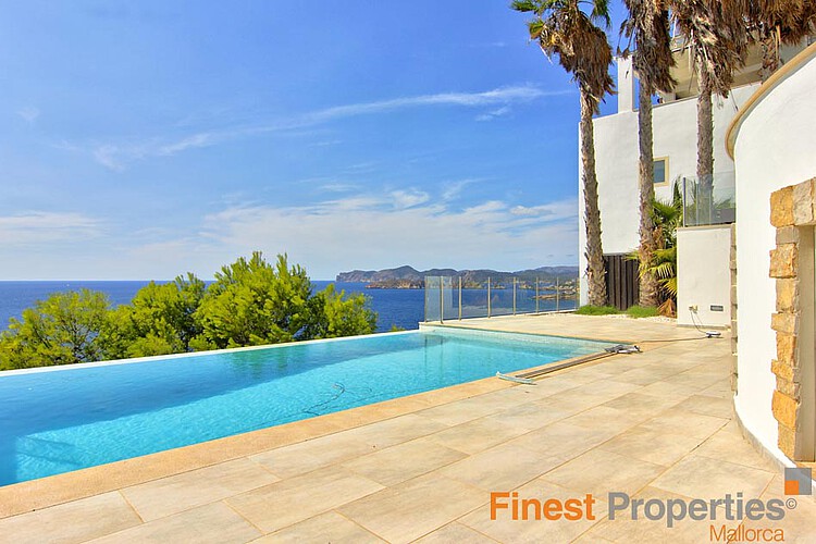 Residential area in the southwest of Mallorca. The villa has approx. 350m² of living space and stands on a 792m² plot. The house offers a bright, open living area, a fitted kitchen with breakfast bar, 3 bedrooms, 3 bathrooms en-suite and a gym, all furnished with high quality materials. From all rooms of the house you have a spectacular view of the sea and romantic sunsets. In addition, there is a separate guest apartment with bedroom, kitchenette and bathroom and its own entrance. The exterior of the property offers a partially covered terrace with lounge and dining area, a large infinity pool, a garden and a garage with direct access to the living area. Further equipment: air conditioning w/c, underfloor heating, central music system, central power supply, central water supply, parking space, double glazed windows. The villa is currently for sale at €4.5m but could also be rented for €15,000 a month. This is payable 1 year in advance. The rental deposit is 2 months' rent. The brokerage fee is 1.5 times the monthly rent. Pool maintenance costs, electricity, garbage disposal and water charges are at the expense of the tenant.