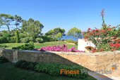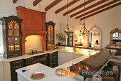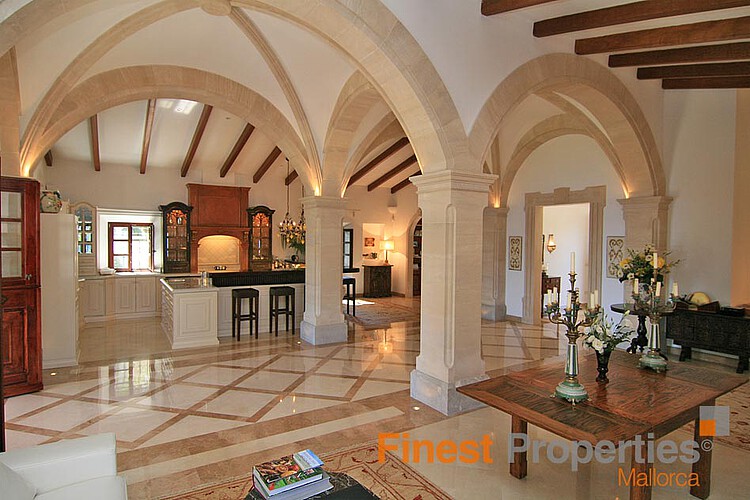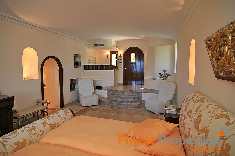 The main house disposes of a large living - dining room with open plan luxury kitchen. Entering this living area one gets impressed by the enormous dome-shaped double height ceiling that connects the kitchen with the living room. Furthermore, there is a TV room and a guest toilet. On the basement is a spacious room that could be converted into a spa area. The second house features a bedroom with en suite bathroom.