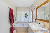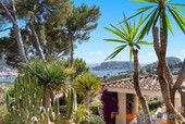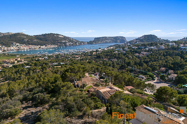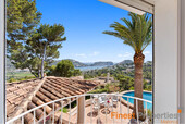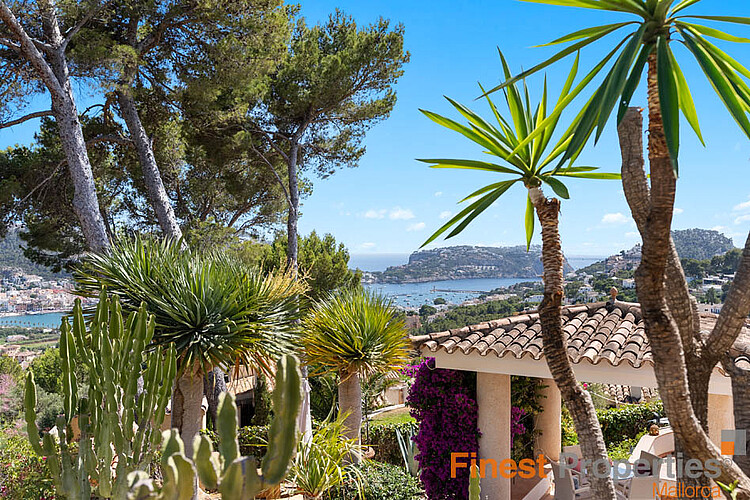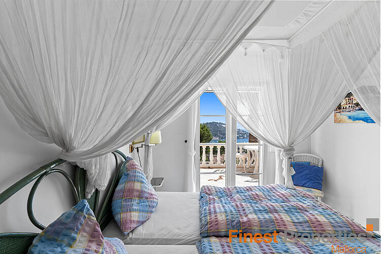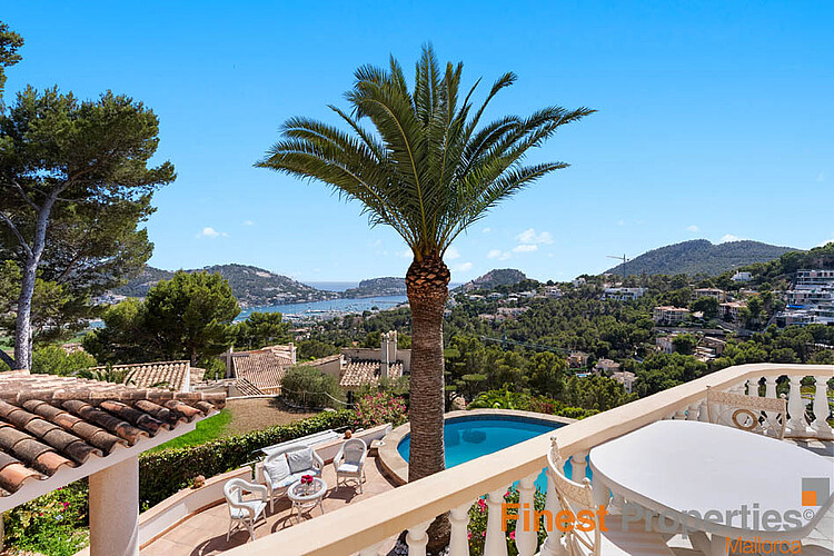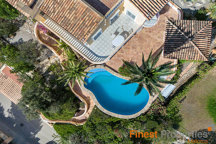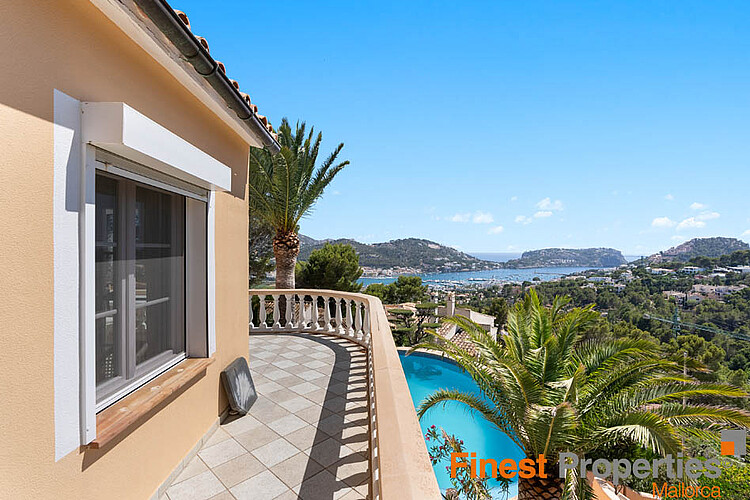 This detached house was built in 1990 on a 930m² hillside plot facing southwest. The very well-maintained house has approximately 316m² of constructed space and approximately 189m² of living space, spread over two floors. The ground floor features an entrance hall, a living-dining room, a kitchen, a utility room, and a guest toilet. The first floor has a master bedroom with en-suite bathroom, three further bedrooms, and a bathroom. All bedrooms have access to a terrace, from where you can enjoy beautiful views of the bay of Port Andratx. Features include gas central heating (radiators), hot/cold air conditioning, PVC double-glazed windows, some with electric heating, shutters, and an alarm system. Outside, a beautiful Mediterranean garden with a pool and sun terraces has been landscaped. A garage offers space for one car. Forty-five steps lead from the garage to the house entrance. An excavation for an elevator has already been prepared. The house can be expanded with an additional 113 square meters of constructed space.
