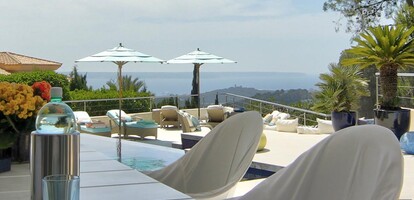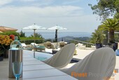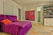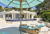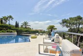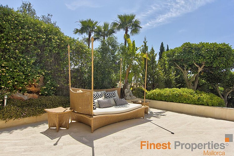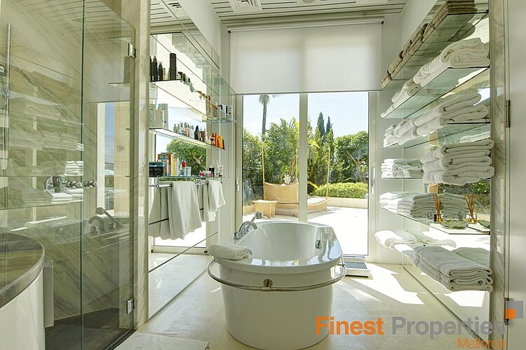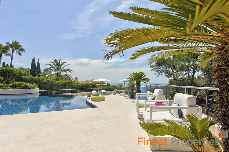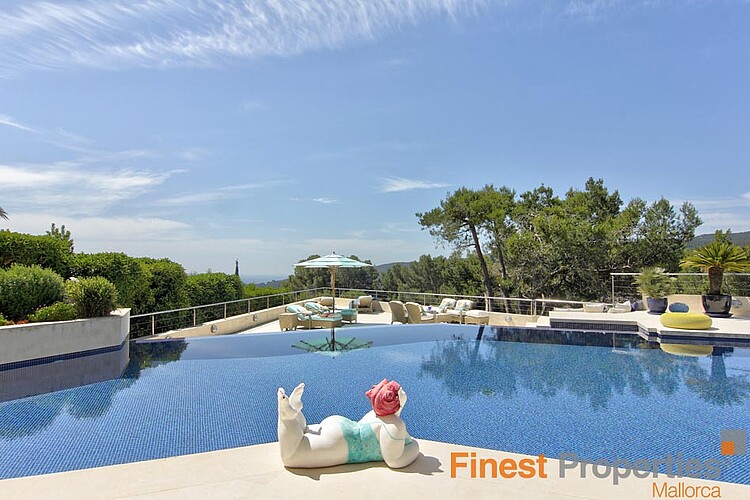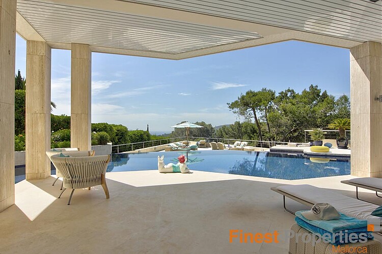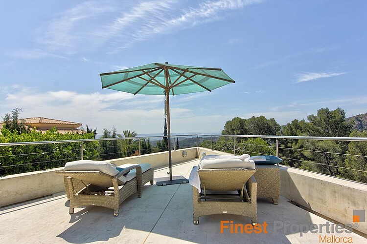 The luxurious and guarded residential area of Son Vida is only 3 km away from Palma and is surrounded by 3 golf courses and two 5 star hotels. This modern villa was built with high-quality materials on a 2,350m² hillside plot. The approx. 650m² of living space is spread over 2 floors. The entrance is on the ground floor. In the entrance hall, which is open at the top, you can reach the 1st floor via an elegant staircase or comfortably with the elevator. Here is a spacious and light-flooded living-dining room with a view of the 300m terrace and a large pool. Impressive from here is certainly the beautiful panoramic view to Palma and the sea. On this level there is a modern kitchen with cooking island (with wine fridge, Gaggenau oven ect.), a library (TV room), the master bedroom with 2 dressing rooms and a bathroom and 3 further guest bedrooms, each with a bathroom en suite. Outside there are open and covered terrace areas with various seating areas, an outdoor shower and access to a 300m² roof terrace, which can also be reached by elevator. The terrace is ideal for house parties or a rooftop party with friends who will be amazed by the panoramic views. On the ground floor there is also an office, a meditation room, a bathroom with toilet and shower, a covered terrace, a room that would be suitable as a sauna and technical rooms. A separate guest apartment of approx. 50m² with living room, kitchen, bedroom and bathroom is available for guests. The equipment includes underfloor heating (oil), air conditioning h/c, aluminum panoramic sliding windows, sliding gates, alarm system and solar system for hot water. There is space for 2 cars in the covered carport. The takeover of furnitures as well as art objects and pictures by well-known artists is negotiable.