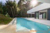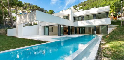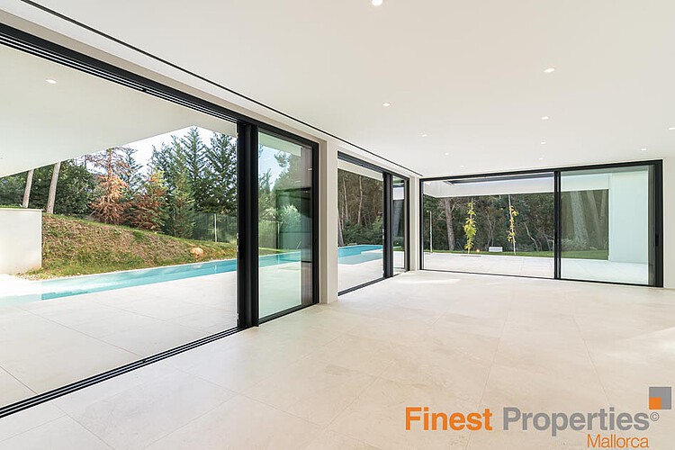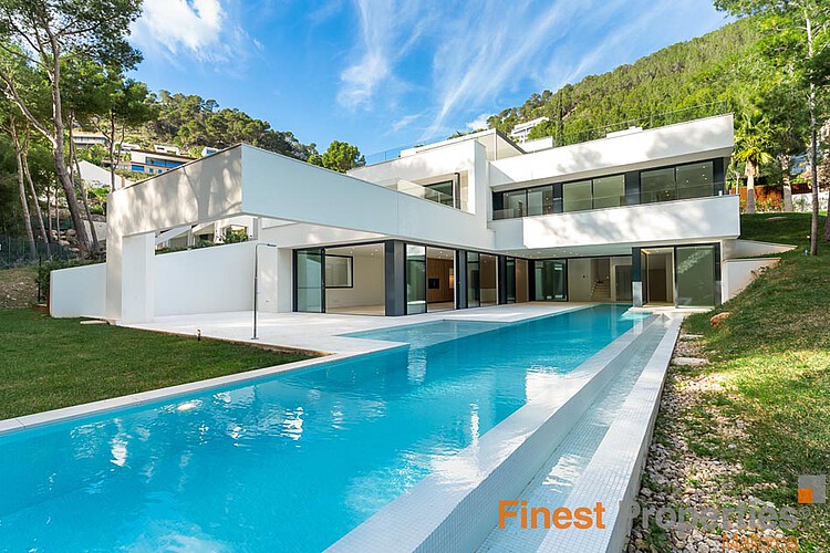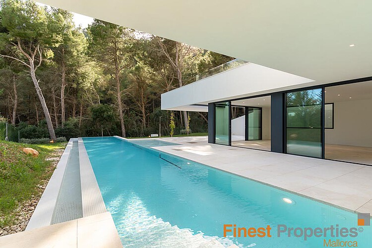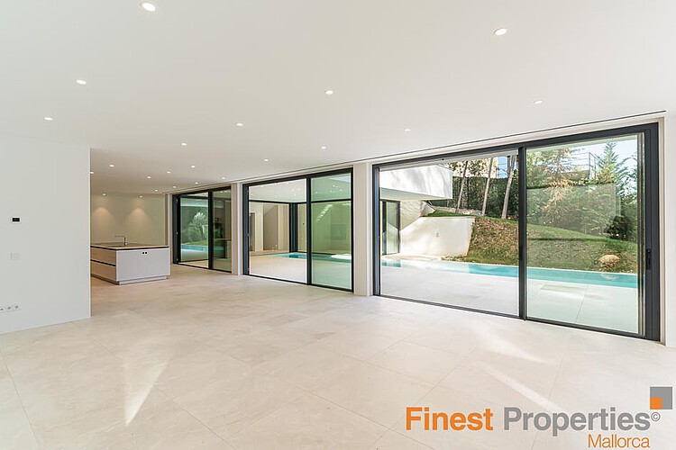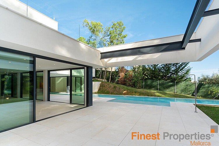 Son Vida is one of the most luxurious residential areas in Mallorca. Palma, the island's capital, is just 5 km away. Son Vida is also surrounded by three 18-hole golf courses and two 5-star hotels. Completion is planned for summer 2025. This architecturally designed house combines state-of-the-art design, smart technology, and refined Mediterranean elegance. Situated on a generous 1,009 m² plot with approximately 400 m² of living space, the villa offers a lifestyle characterized by sophistication, comfort, and privacy. Upon arrival, you will enter a fully smart home thanks to a discreet fingerprint access system, where every element—from lighting and climate control to security—seamlessly adapts to modern living. At the heart of the property is a spectacular 25-meter swimming pool on the main living level, directly connected to an elegant Siematic kitchen with high-end Gaggenau appliances. The open-plan living and dining area flows seamlessly into sunny terraces and shaded patios, offering stunning views across the lush landscape of Son Vida. Each room has been designed to blur the boundaries between indoors and outdoors, creating an ideal atmosphere for tranquil relaxation and stylish entertaining. The sleeping level features a luxurious master suite with a walk-in closet and en-suite bathroom. This is complemented by three further double bedrooms, each with its own bathroom, providing privacy and comfort for family and guests alike. The lower level offers a variety of uses, whether as a private gym, home cinema, or entertainment lounge. A striking architectural detail – a window overlooking the pool above – floods this level with natural light, lending it a unique atmosphere of character and warmth. A temperature-controlled wine cellar completes the ambiance and reflects the villa's refined attention to detail. Every aspect of Villa La Vie has been designed for efficiency and elegance, including a double garage with a solar-paneled pergola, underfloor heating, integrated air conditioning, and a landscaped garden with automatic irrigation. As the last development on the street, it offers the advantage of a quiet and established environment, guaranteeing you a sense of peace and tranquility from day one.